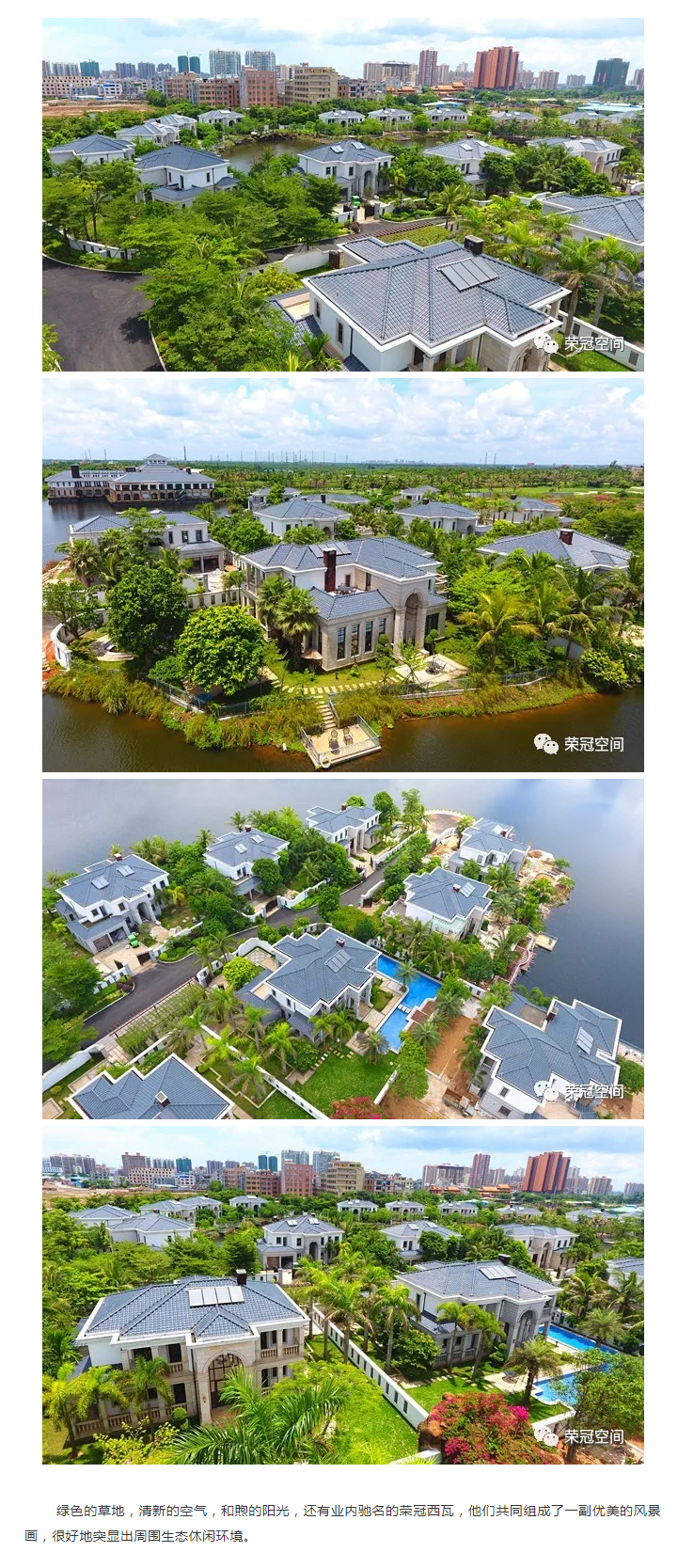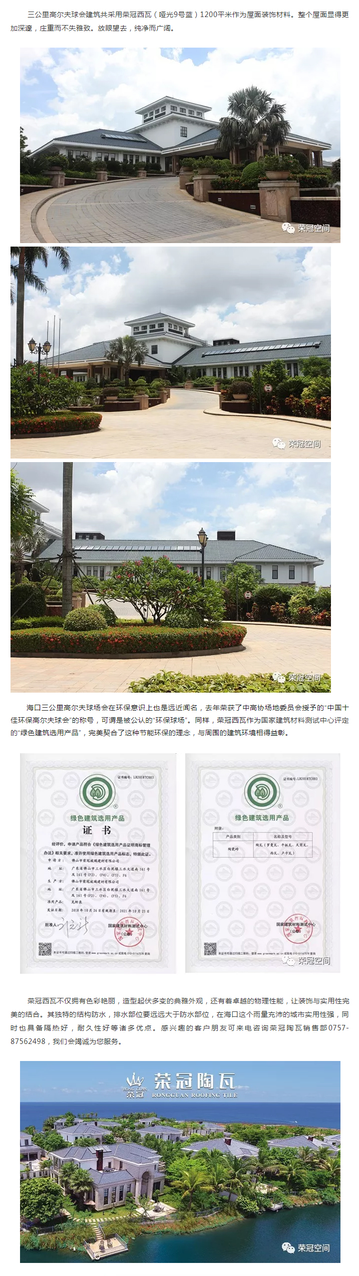 榮冠西瓦具備隔熱好、耐久性、色彩鮮艷等諸多功能和特色,造型起伏多變,富有古典的歐式風味,鋪蓋后自然高雅,格調獨特,是各種中高檔酒店別墅、樓宇亭臺、大型商業中心、市政工程等建筑的首選屋面裝飾材料。