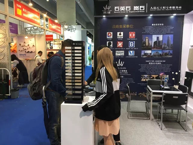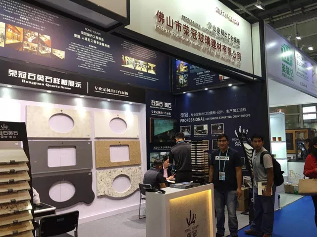 榮冠出口部工作人員向蒞臨展位的客戶講解了榮冠石英石臺面產品的品質優勢,與來自全球各地的客商深入洽談合作。