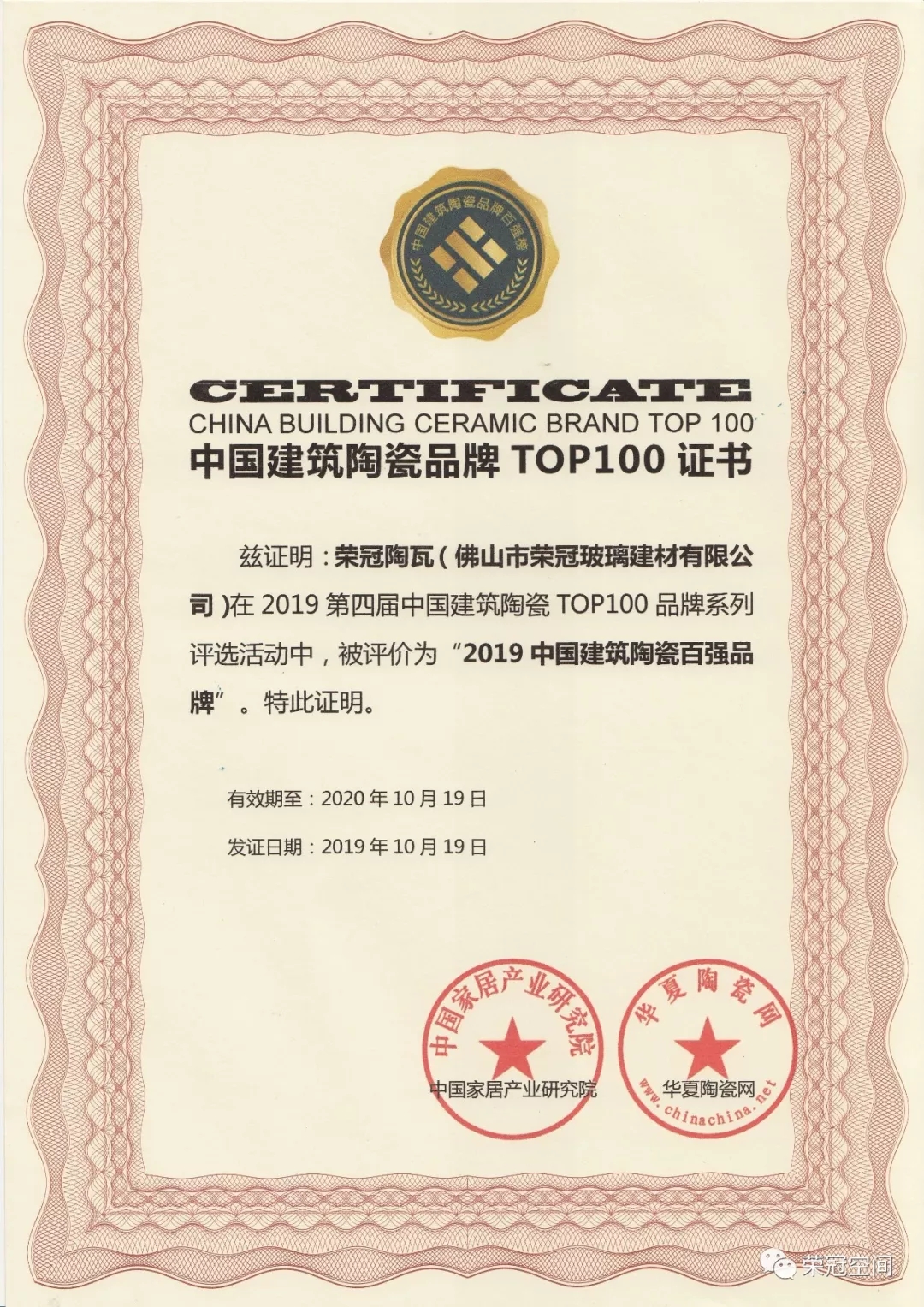 此次獲得“2019中國建筑陶瓷百強品牌”,既代表了業界對榮冠的肯定,同時也是榮冠品牌繼續前進的動力。接下來,榮冠陶瓦將不負期望,砥礪前行,再創輝煌。