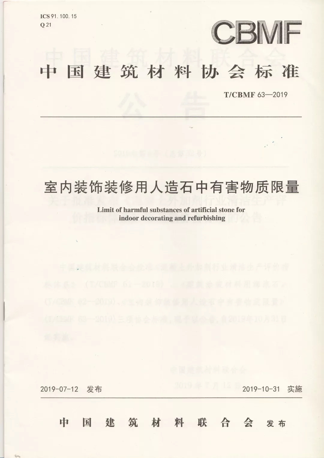 《室內裝飾裝修用人造石中有害物質限量》(T/CBMF63-2019)標準的發布實施,旨在完善人造石安全評價體系,制定適合人造石產品特點的有害物質測試方法及限量要求。標準限量值根據行業先進生產水平制定,并充分參考了GREENGUARD等國際先進指標要求,已達到國際先進水平。