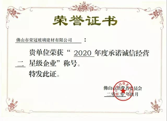 無獨有偶,在今年4月份,榮冠公司同樣被佛山市消費者委員會被評定為“承諾誠信經營二星級企業”。這是社會各界對佛山市榮冠玻璃建材有限公司多年來誠信經營的肯定,不僅樹立了企業良好的形象,增強了企業的市場競爭力,還有利于推動社會信用體系的建設,促進經濟社會和諧發展。