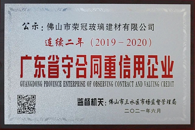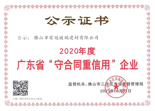 近期,佛山市三水區(qū)市場監(jiān)督管理局對2020年度廣東省“守合同重信用企業(yè)”進行公示,榮冠公司憑借良好的市場信譽和優(yōu)質(zhì)的產(chǎn)品服務(wù),順利通過市場監(jiān)管部門的最終評審,并獲相應(yīng)的榮譽牌匾和證書。在三十多年的誠信經(jīng)營中,榮冠公司屢獲該項殊榮。
