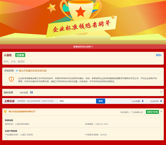 在未來,伴隨著人造石材各種標準的制定,對企業的生產和服務會有更為嚴格和規范的要求。作為企業標準“領跑者”,榮冠公司將不懈追求,繼續提升企業標準化水平,促進行業規范化,引領行業高質量發展。