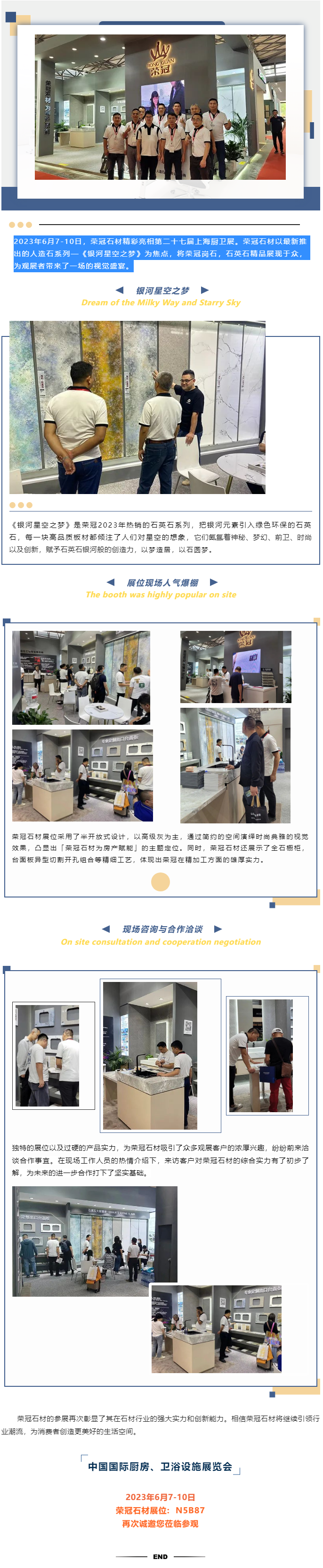 2023年6月7-10日,榮冠石材精彩亮相第二十七屆上海廚衛展。榮冠石材以最新推出的人造石系列—《銀河星空之夢》為焦點,將榮冠崗石,石英石精品展現于眾,為觀展者帶來了一場的視覺盛宴。