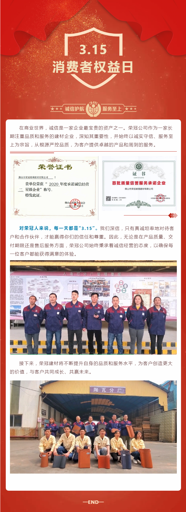 在商業(yè)世界,誠(chéng)信是一家企業(yè)最寶貴的資產(chǎn)之一。榮冠公司作為一家長(zhǎng)期注重品質(zhì)和服務(wù)的建材企業(yè),深知其重要性并始終以誠(chéng)實(shí)守信、服務(wù)至上為宗旨,從根源嚴(yán)控品質(zhì),為客戶提供卓越的產(chǎn)品和周到的服務(wù)。