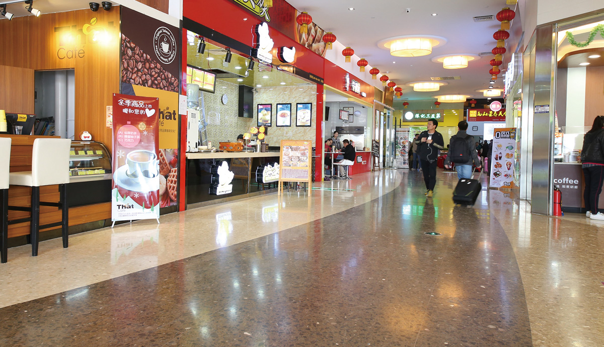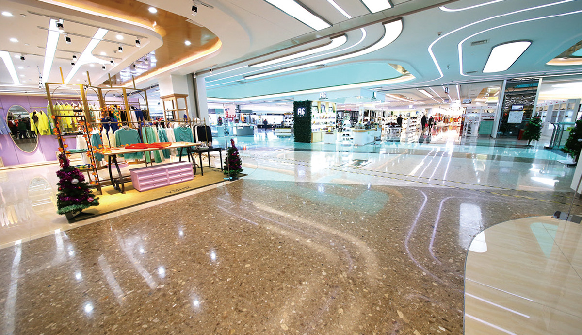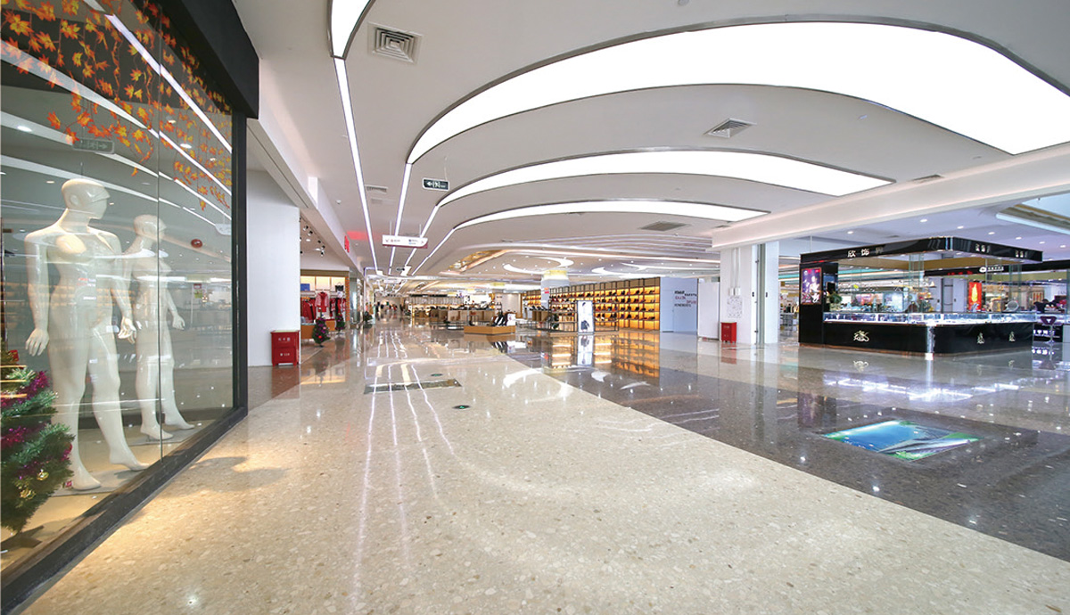 運用大花系列的崗石,晶瑩通透配上柔麗悅目多元化之色彩,將單調枯燥的人行通道巧妙地幻化為立體之視覺藝術,三色列崗石拼接在一起,如行云流水,優美典雅、光潔清麗,使整個購物點的地面具有透明透光的質感。